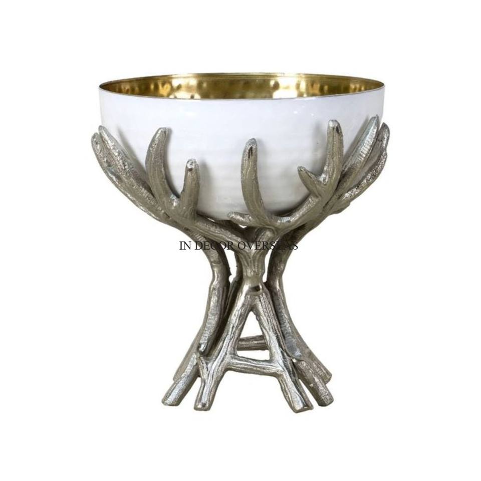 Qualité supérieure Forme ronde Couleur argent Bol poli brillant Plaqué or Fleurs et feuilles Design Stand Metal Made