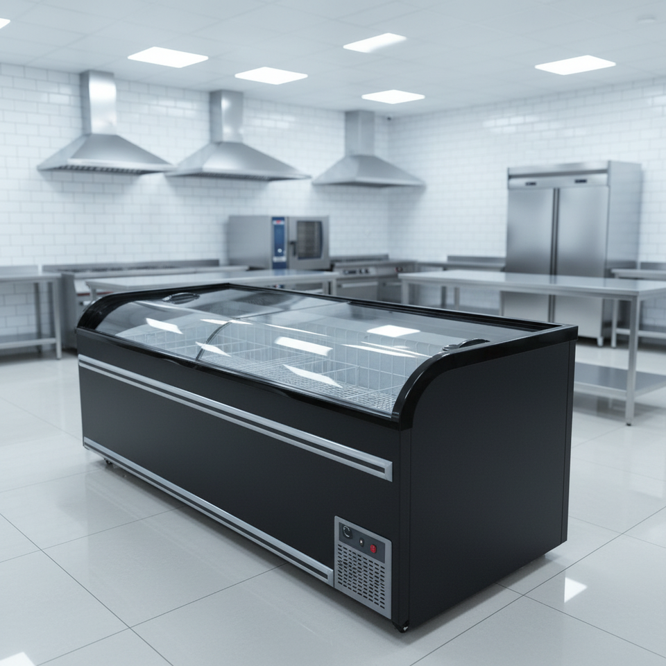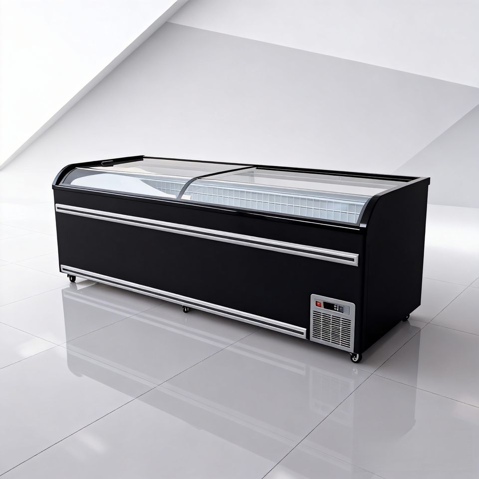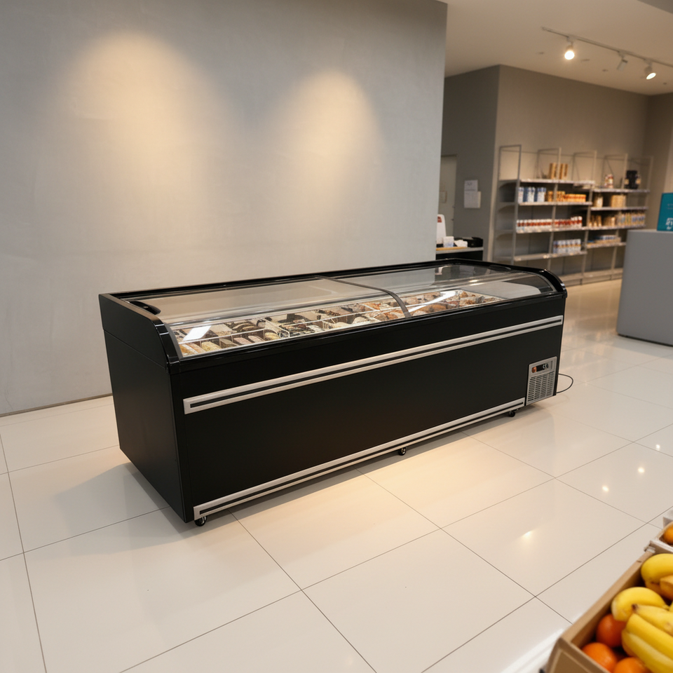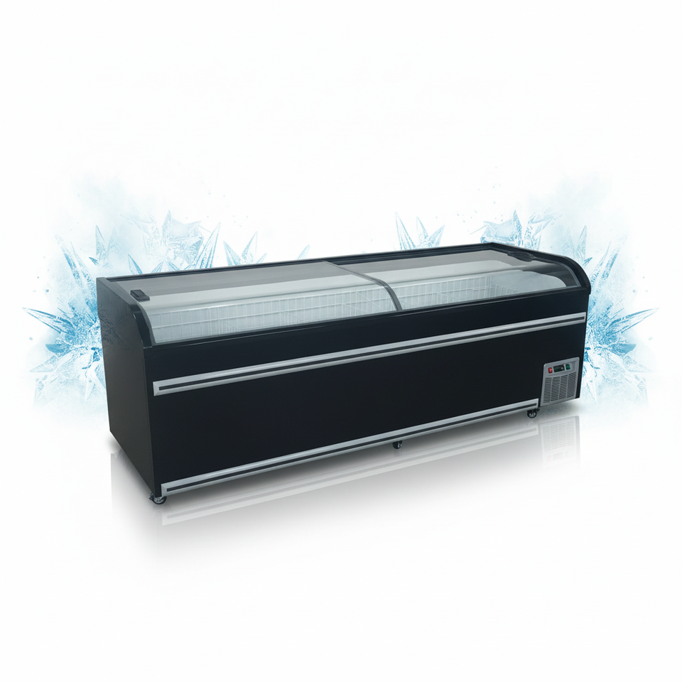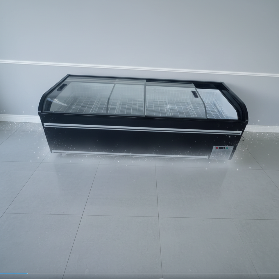Congélateur îlot européen pour supermarché, à couvercle coulissant ouvert en hauteur, pour affichage combiné d'aliments surgelés en sac et de viande