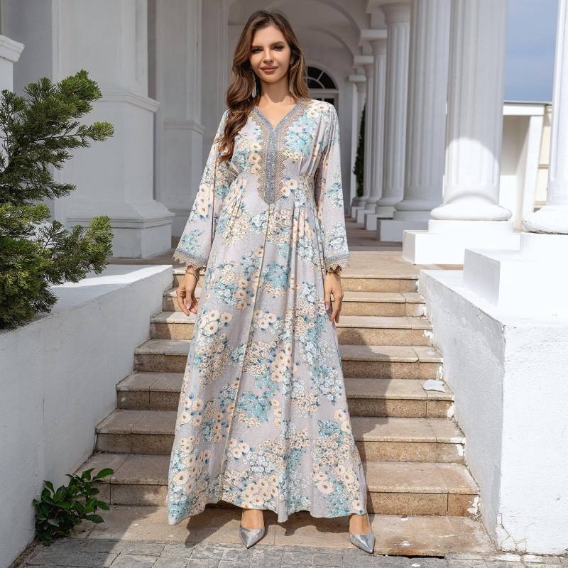 Supplier High Quality Middle East Muslim Printed Floral Evening V-Neck Breathable Waist Temperament Long Sleeve Turkish Dress