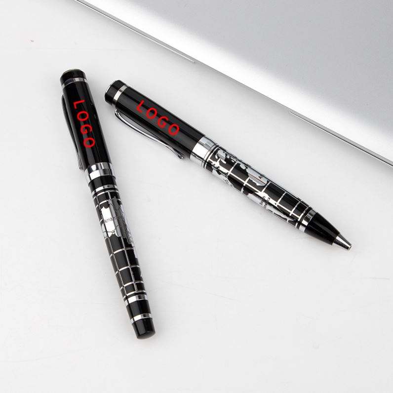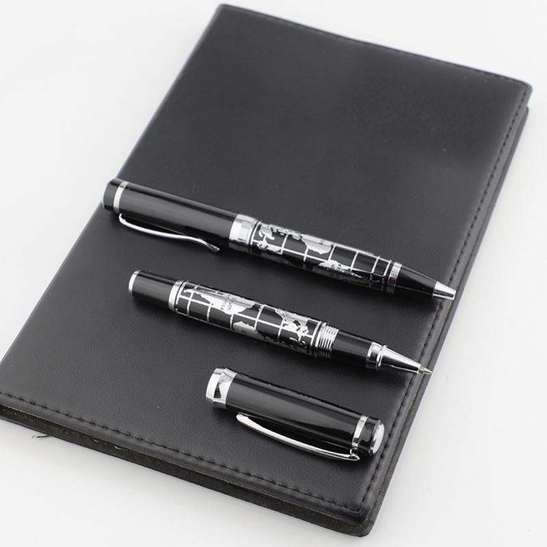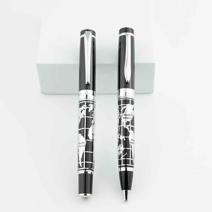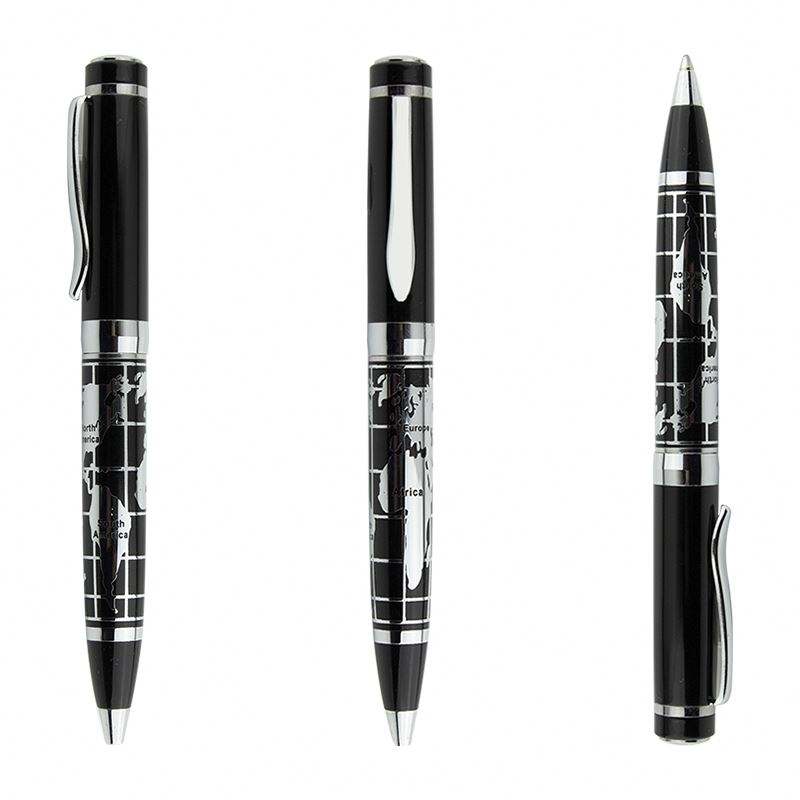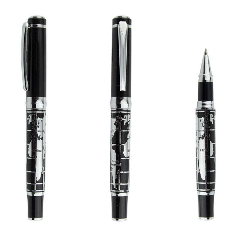 Stylo de qualité avec motif de corrosion personnalisé en relief noir et corps argenté, avec carte du monde en relief