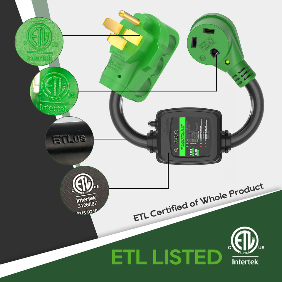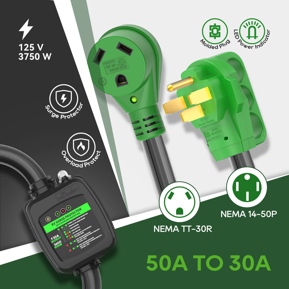 Protecteur de surtension 50 ampères à 30 ampères cordon adaptateur RV avec protection contre les surcharges, adaptateur d'alimentation électrique NEMA 14-50P à NEMA TT-30R