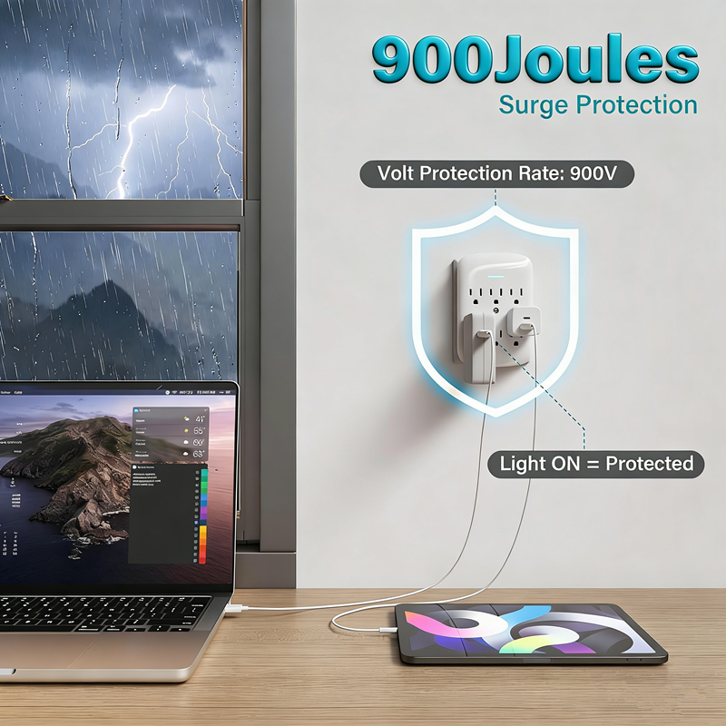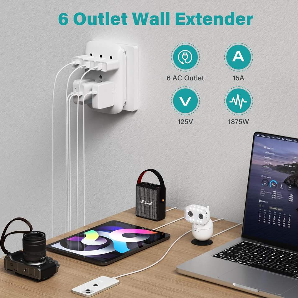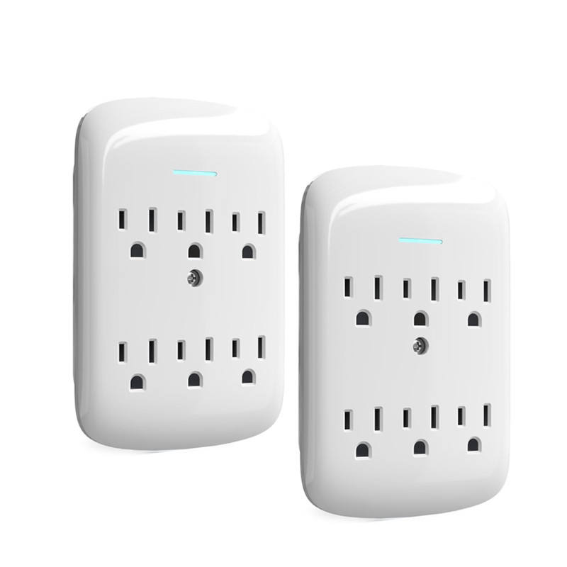 Multiprise murale 6 prises avec protection contre les surtensions, lot de 2, adaptateur multiprise 3 broches avec indicateur lumineux