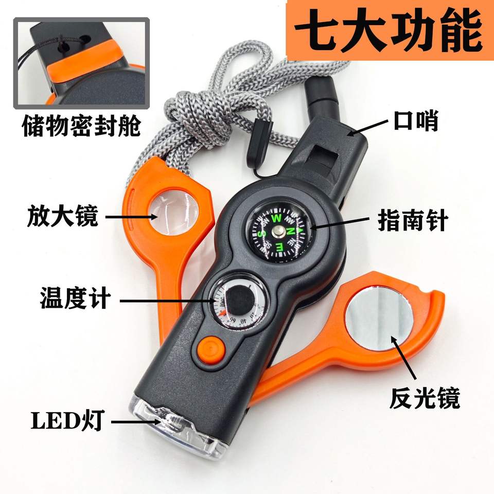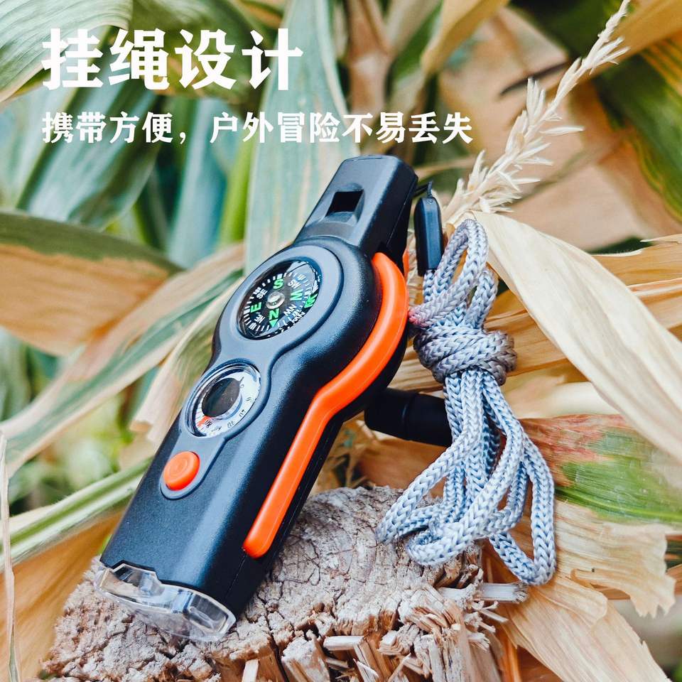 Sifflet de survie avec boussole, thermomètre, lumière LED, sept en un, outil d'urgence pour le camping en plein air, compact, en plastique, multifonction