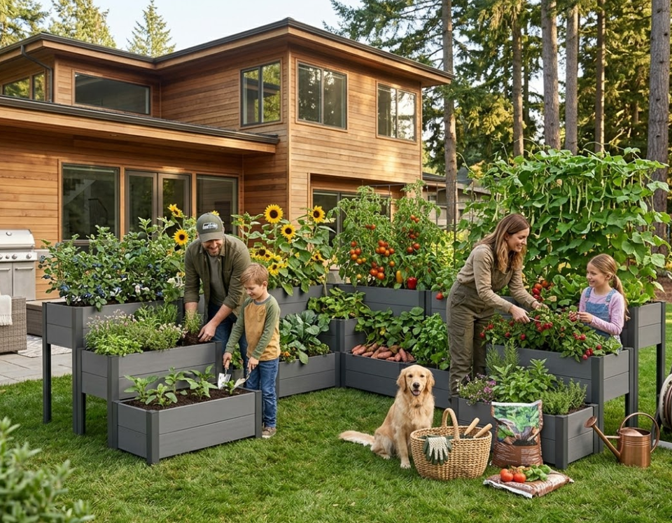 Jardinière surélevée en WPC à lattes, durable et facile à assembler, emballage compact, pour terrasse domestique