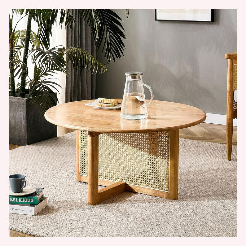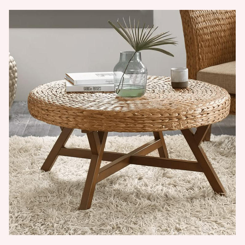 Table basse en rotin artisanale et durable avec plateau relevable réglable et compartiment de rangement dissimulé
