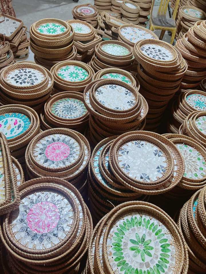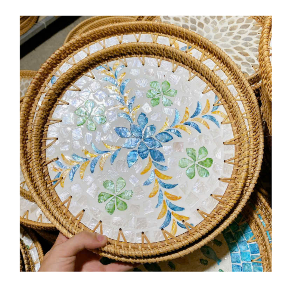 Plateau de service en rotin naturel durable avec incrustation de nacre, plateau de décoration artisanal pour la maison