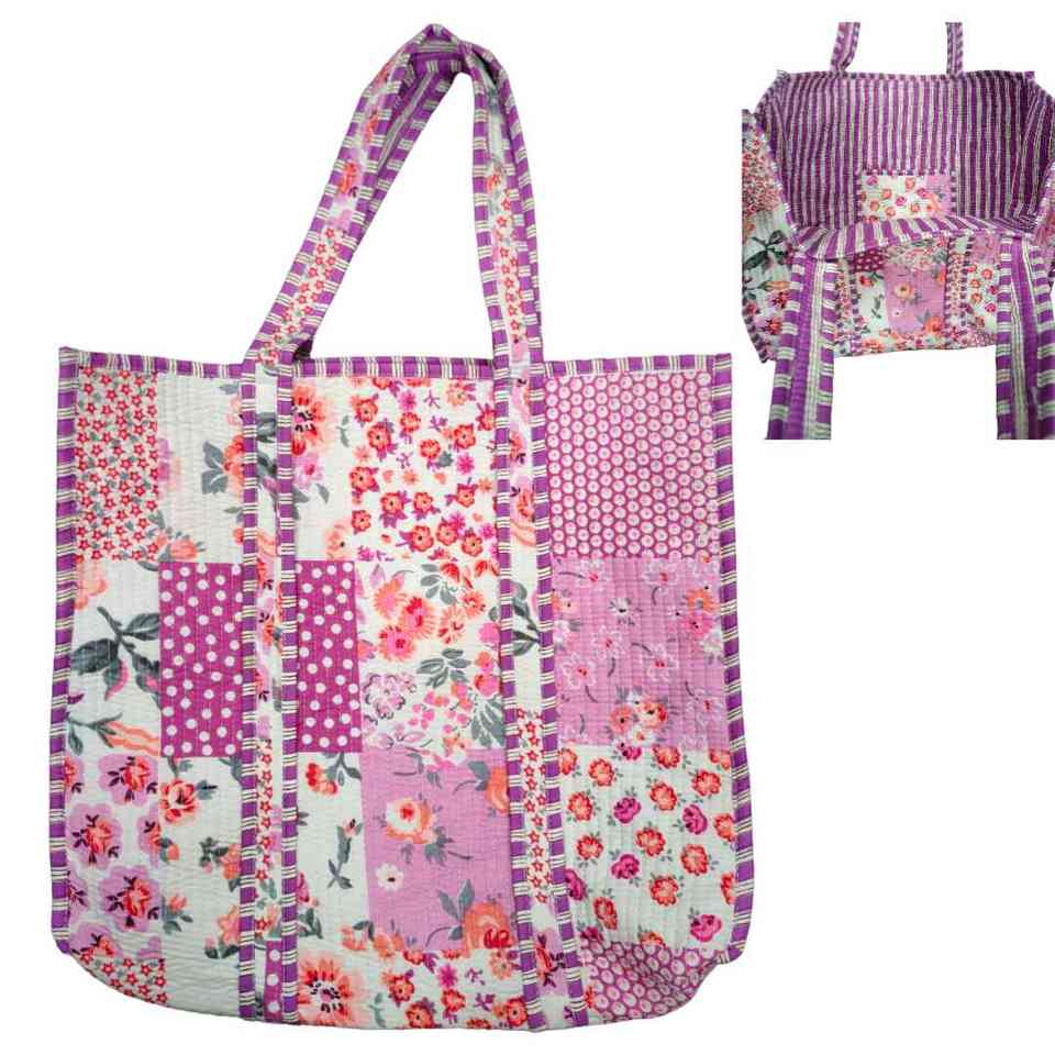 Sustainable Pink Patchwork Floral Block Print Tote Bag - Quilted Cotton Handbag