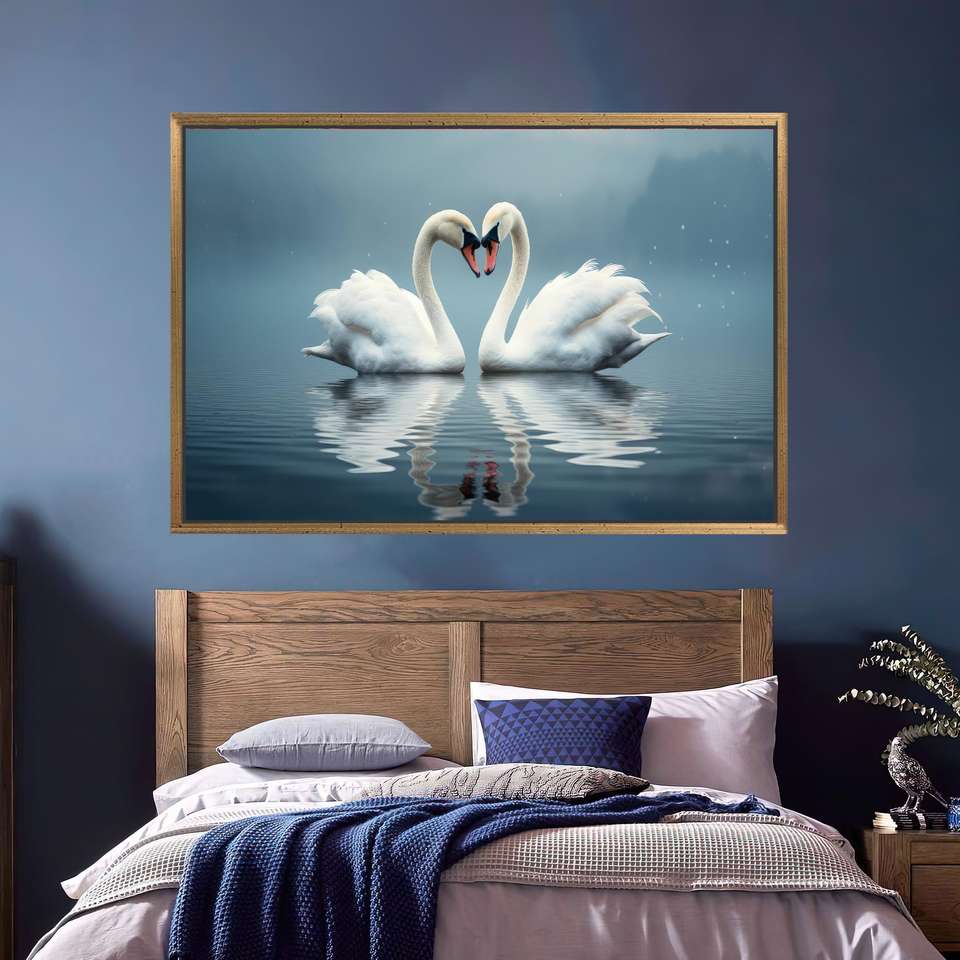 Décoration sur toile Swans In Love - Œuvre d'art imprimée sur toile pour une décoration intérieure élégante, 1P : encadré or