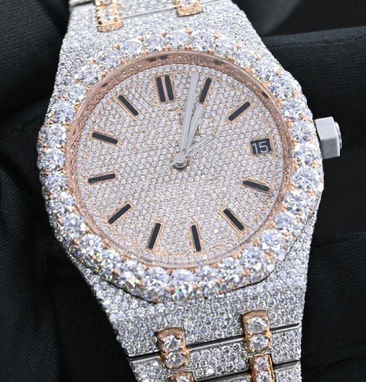 Montre Eta Movement en or rose entièrement sertie de diamants moissanite, cadran romain, collet et lunette surélevés