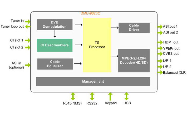 Sortie:CVBS, YPbPr, Interface HD, ASI * 2, XLR, L/R * 2