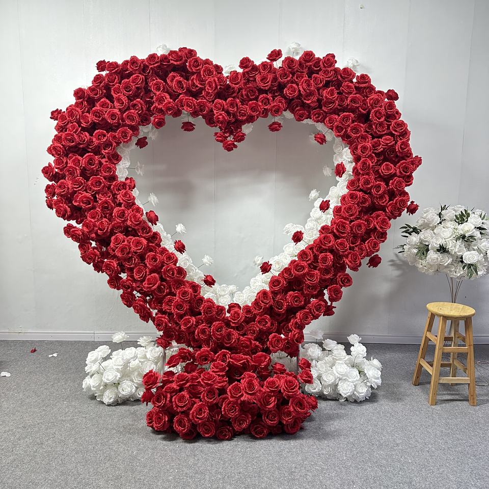 Arche de fleurs artificielles rouge T-HFA133, toile de fond personnalisée, arche en forme de cœur, arche de fleurs de luxe en roses pour les arrangements de mariage
