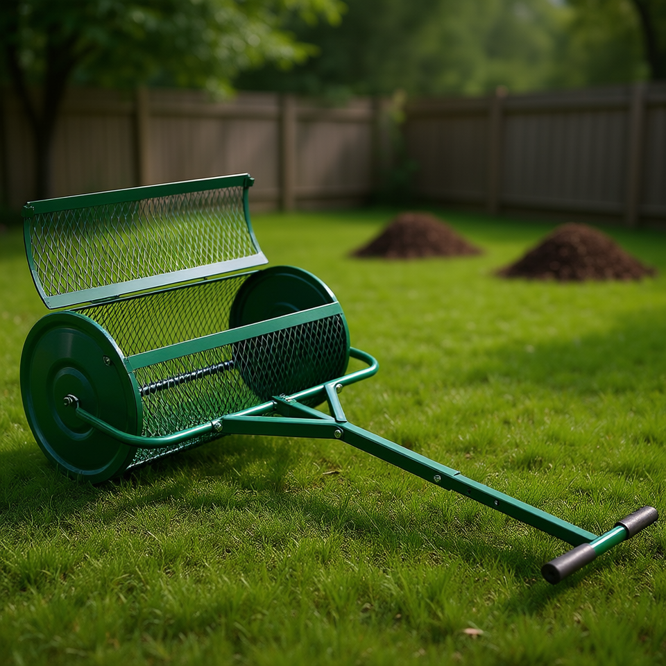 Épandeur de compost en métal à poignée en T, 24 pouces, pour l'entretien des pelouses et des jardins, épandeur à rouleaux pour engrais et fumier