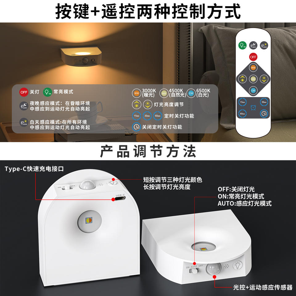 Veilleuse à capteur de présence humaine T112, LED, murale, rechargeable avec USB C, fixation magnétique pour chambre et couloir
