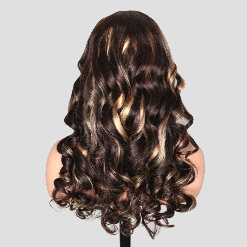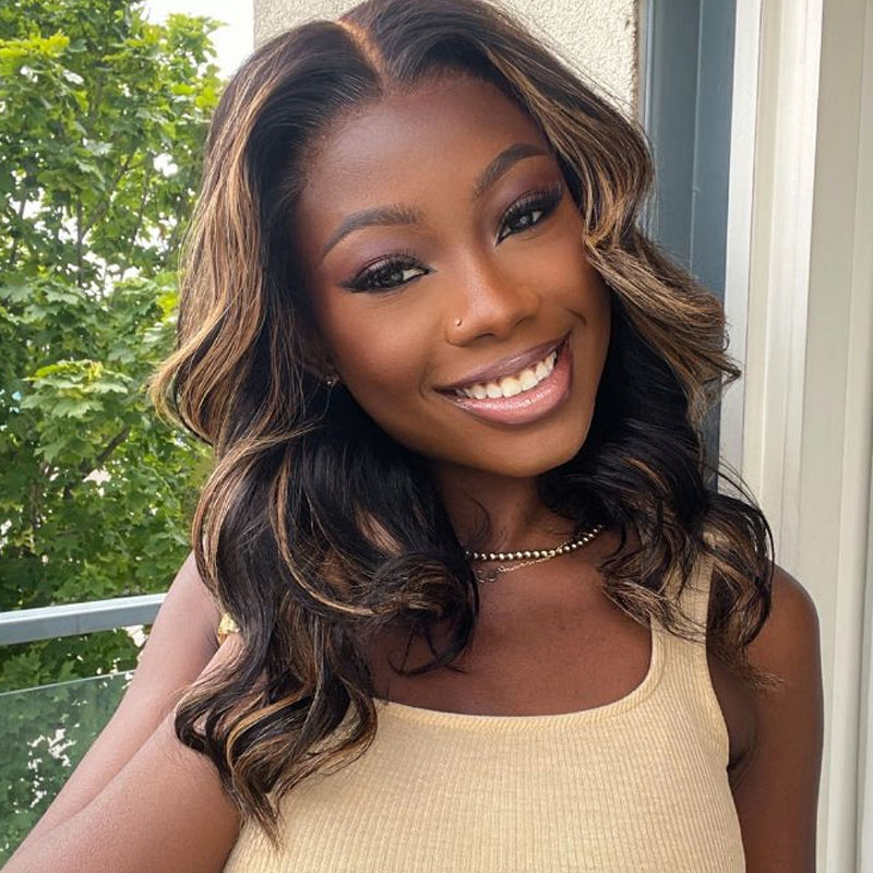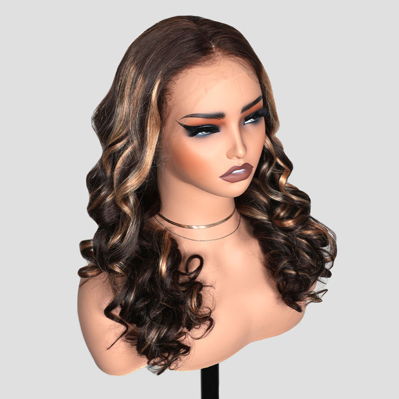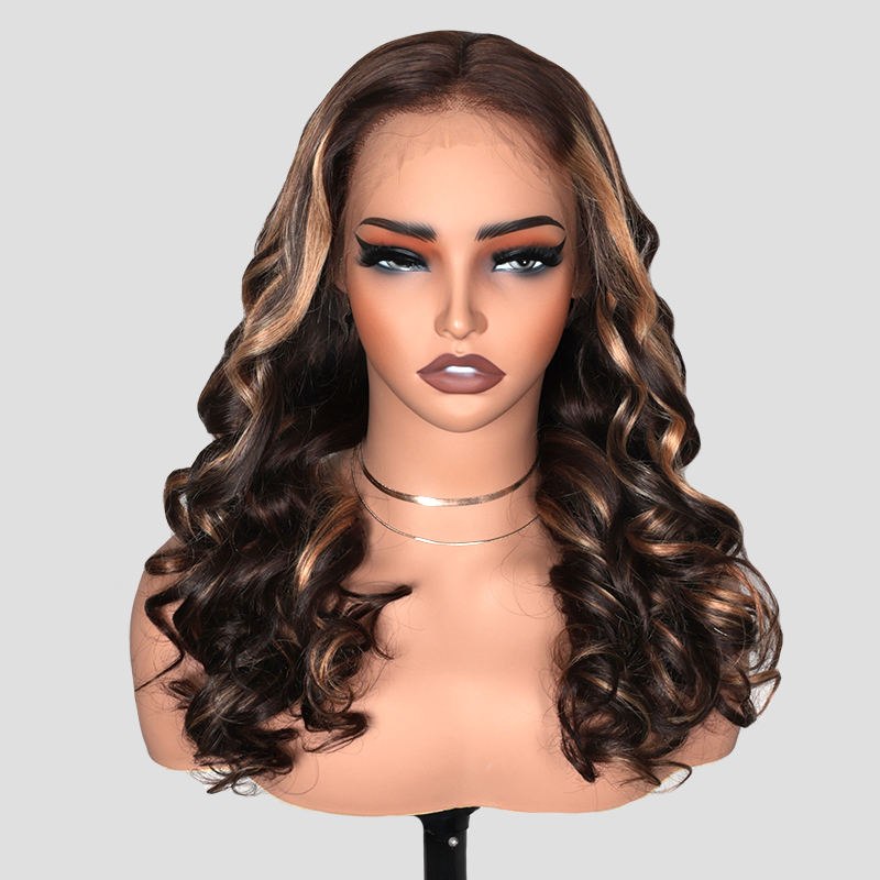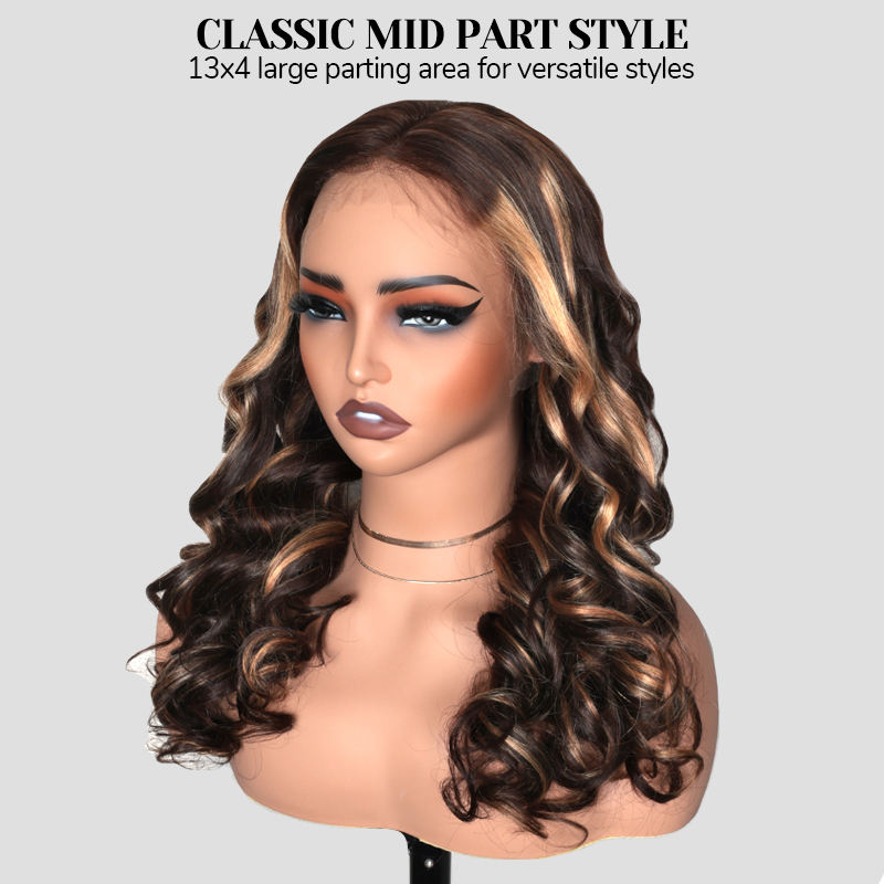 T4P4/30 # Perruques sans colle en cheveux humains à ondulations souples, perruque Lace Front 13x4 avec nœuds blanchis, raie classique au milieu et mèches Ombré