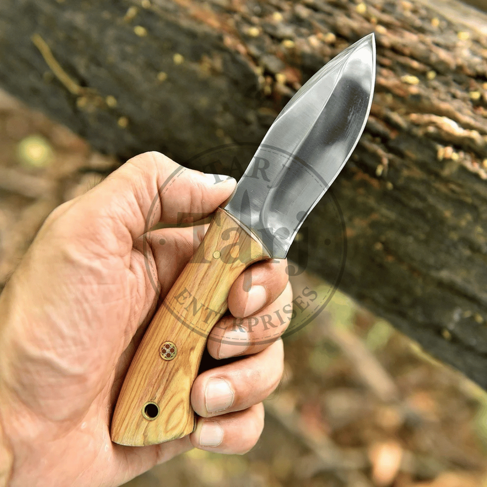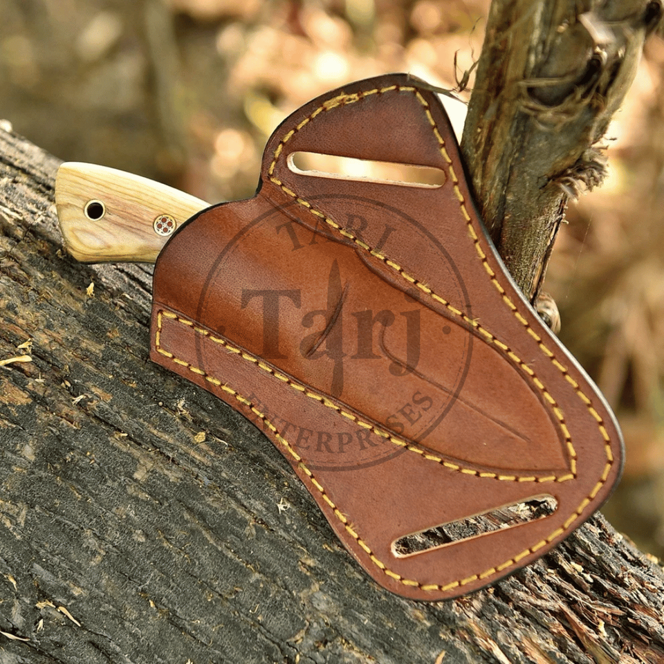 Couteau de chasse TARJ ENTERPRISES 9355, lame fixe artisanale en acier Damas, manche en bois d'olivier, pour le camping en plein air, étui en cuir, OEM