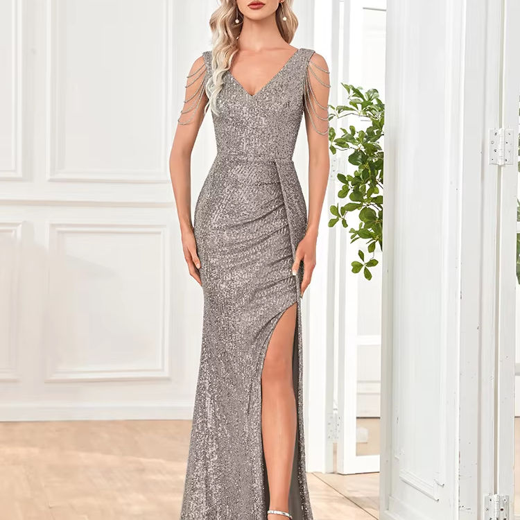 Nom du produit:Sirène paillettes plis robe longueur au sol