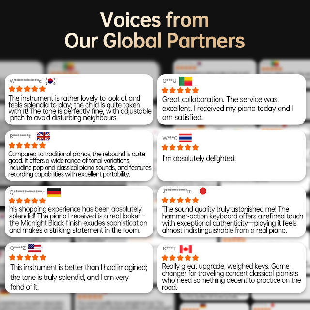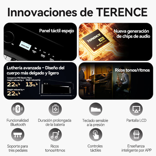 Pliable, Portable, Léger, Affichage numérique, Rechargeable, Multifonction, Action marteau, Haut-parleur intégré, Clés pondérées, Enregistrement, Écouteur Jack, Touches tactiles, Entrée microphone, Mode duo, Programmable, Mode split, Clé sensible à la vélocité