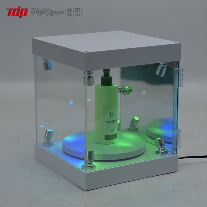 TERMEIN Boîte de présentation pour figurines avec projecteur LED RGB en acrylique écologique, base rotative, prise 12V