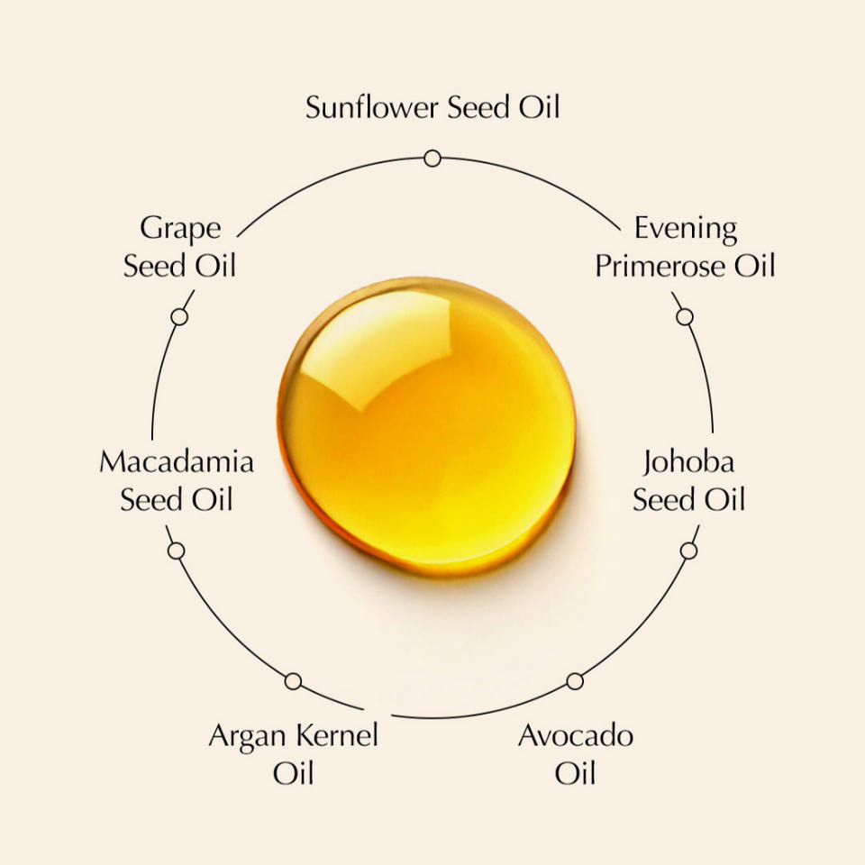 Sunflower Seed Oil, Grape Seed Oil, Water, Caprylic/Capric, Triglyceride;, Squalane, Evening Primrose Oil, Macadamia Seed Oil, Jojoba Seed Oil;, Argan Kernel Oi, Avocado Oil, Butylene Glycol, Tocopherol; 1,2-Hexanediol, Collagen Extract, Hydrolyzed Elastin;, Sodium Hyaluronate, Lecithin, Polysorbate 20, sh-Oligopeptide-1, sh-Polypeptide-11