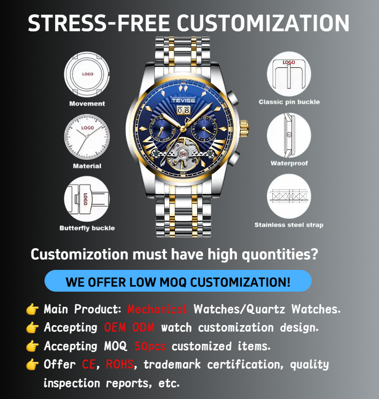 Montre mécanique TEVISE 9005F, automatique, tourbillon, calendrier, marque de luxe, logo personnalisé