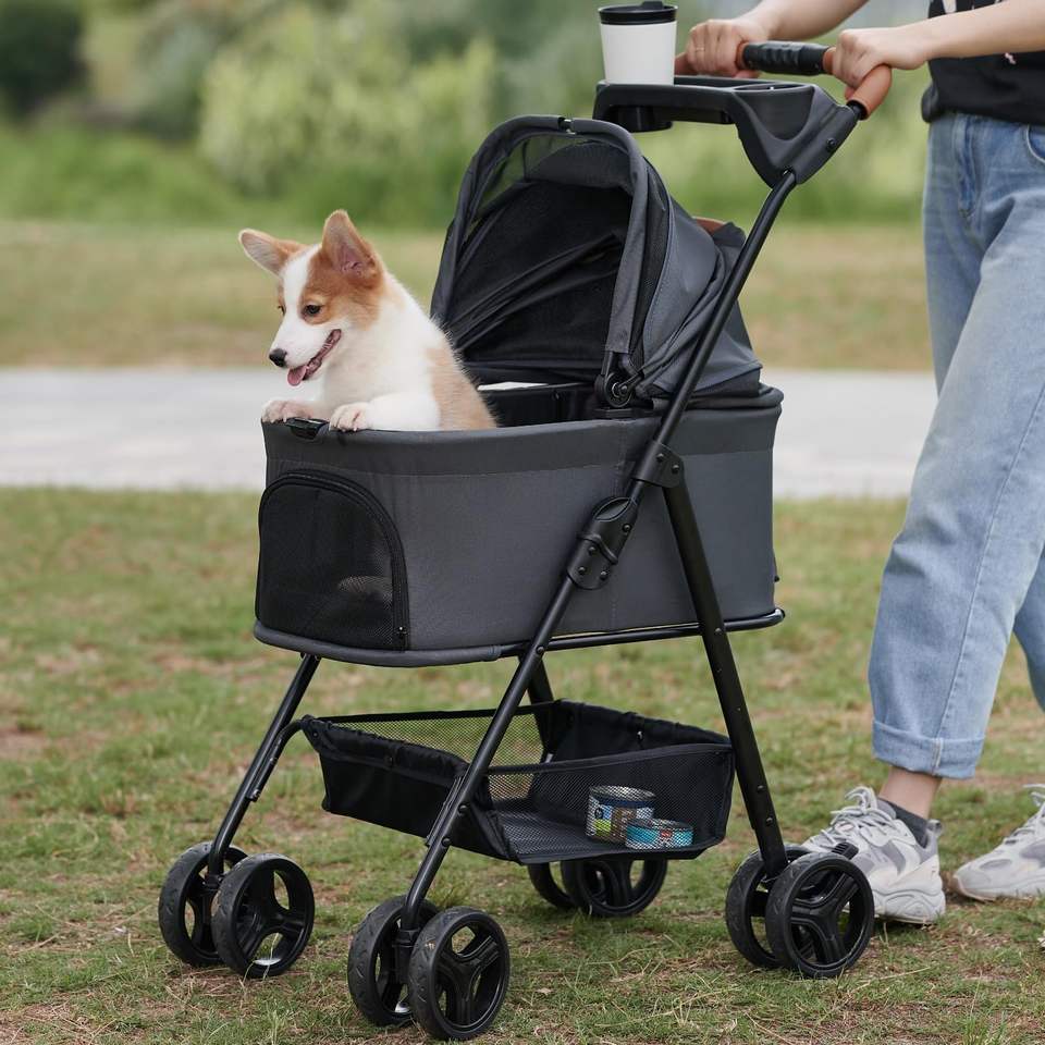 Chariot pliable TH-PPS-098 pour animaux de compagnie avec couverture solaire réglable et rembourrage supplémentaire et cadre solide pour de longues promenades