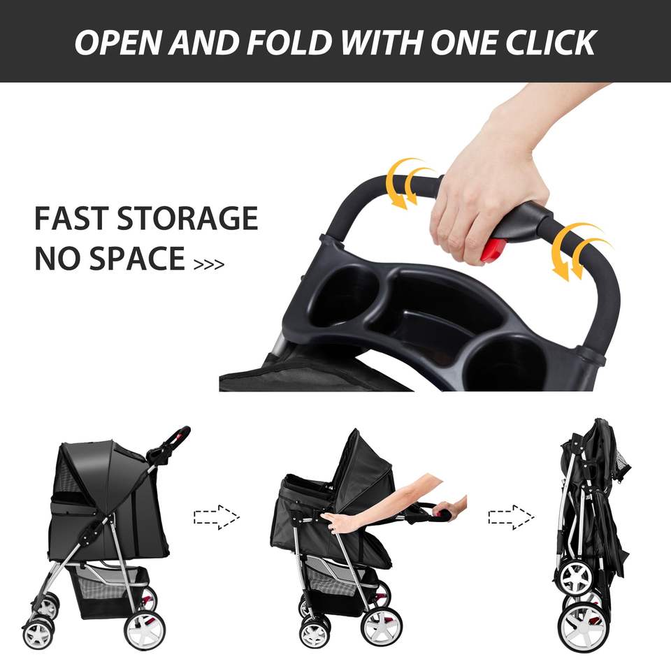 Poussette pliable TH-PPS-103 pour animaux de compagnie avec plateau de rangement en maille à glissière, porte-gobelet facile à assembler conception personnalisée pour les animaux de compagnie