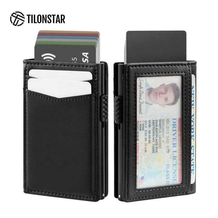 TILONSTAR TVC329 Offre Spéciale portable RFID bloquant les affaires à deux volets en cuir aluminium Pop Up porte-cartes de crédit portefeuille pour hommes