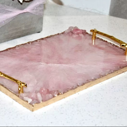 Plateau de service en résine artisanale TIMELESS CRAFT, thème quartz rose, avec bord peint en or, taille personnalisée, décoration de table