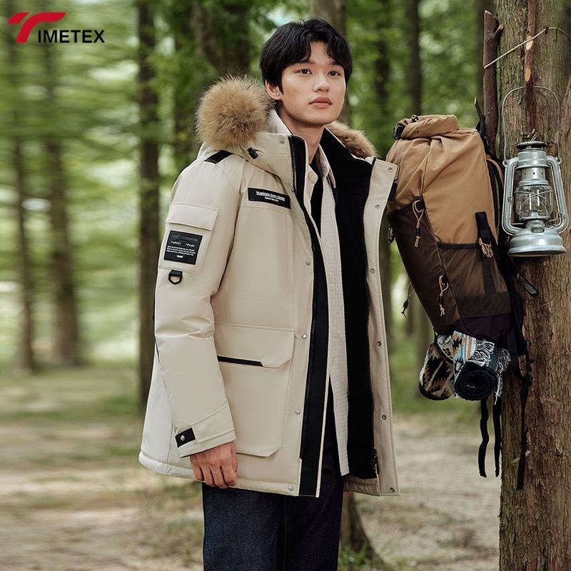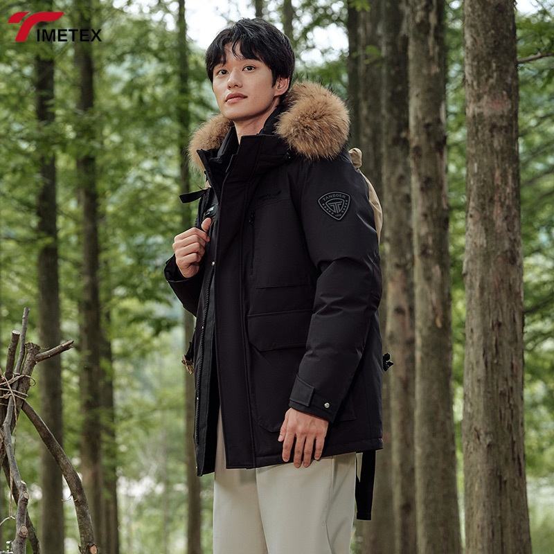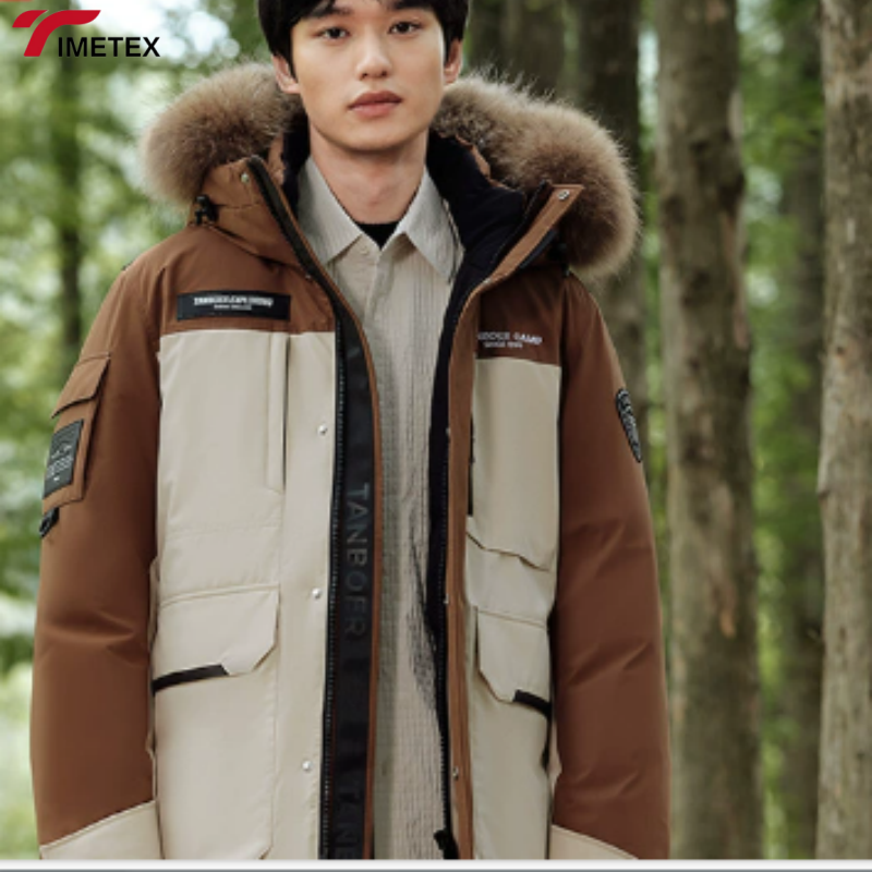 TIMETEX-Manteau personnalisé en duvet pour homme, grande taille, capuche en fourrure de duvet gris, tissu de laine formel, fermeture à glissière, motif lettre, sans col sur le devant