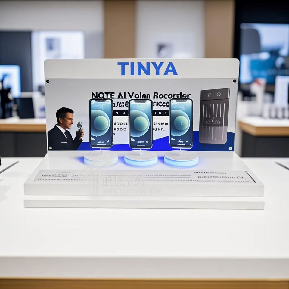 Présentoir LED détachable TINYA Fashion Counter en acrylique PMMA avec enregistreur IA pour téléphone portable, batterie externe et éclairage – Idéal pour les magasins de détail