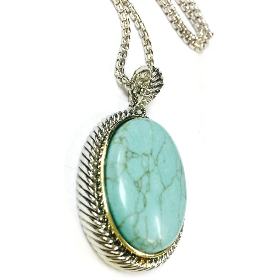 Collier chaîne maille gourmette bicolore TJ Magic plaqué rhodium avec pendentif ovale turquoise orné de zircon émeraude et de diamant moissanite