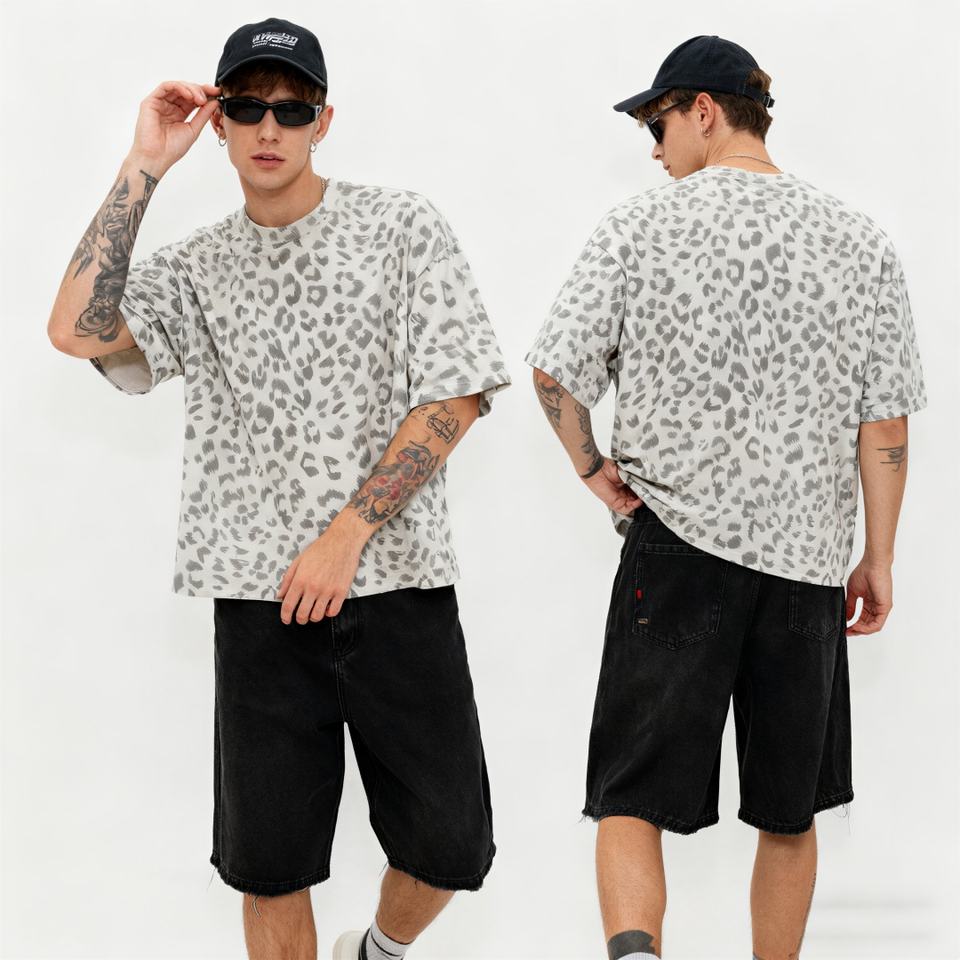 T-shirt pour homme TKAN645D OEM/ODM, impression personnalisée du logo, graphique, poids lourd, 100% coton, style hip-hop, léopard, vintage, lavage à la pierre