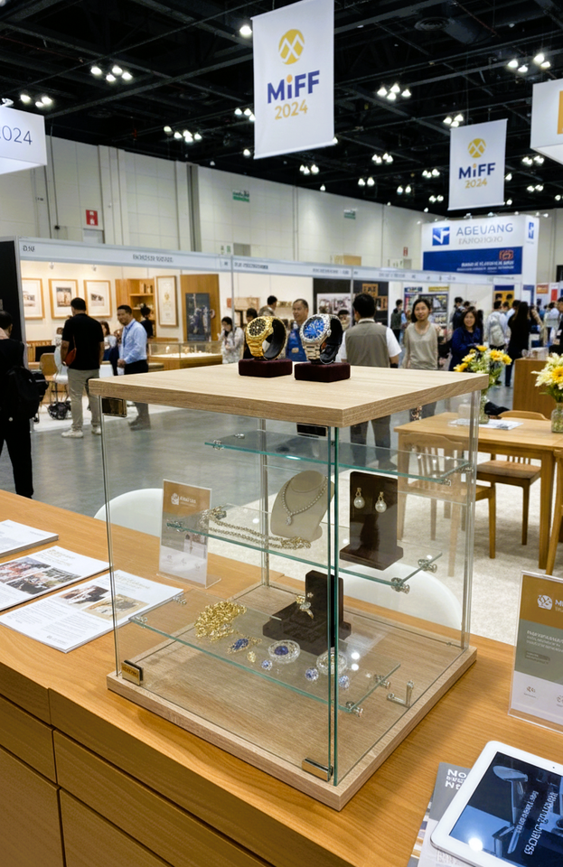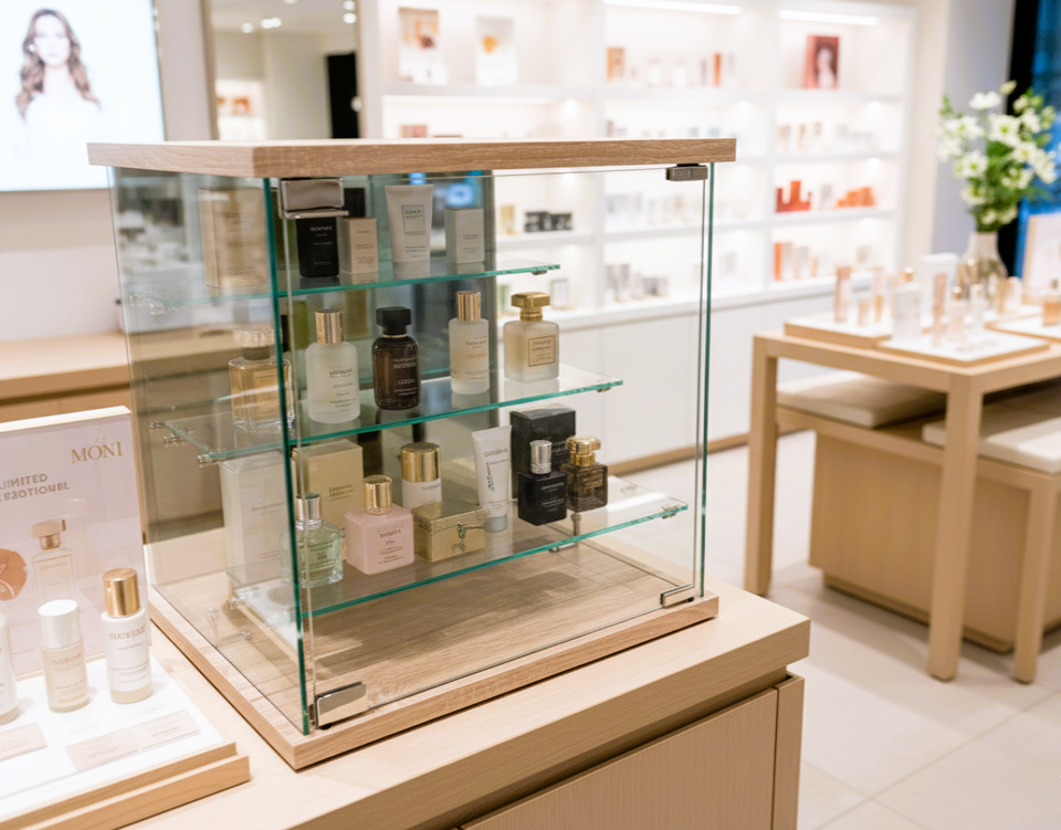 Vitrine en verre trempé personnalisable TMG-G364-2 avec base en bois et plateau – Design moderne, mobilier de luxe pour la maison, idéal pour les bijoux