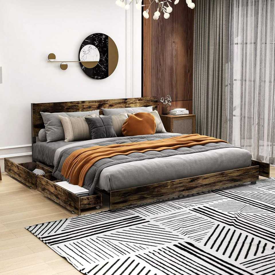 Cadre de lit king-size en pin massif TNT, design traditionnel durable, tête de lit avec rangement à quatre compartiments, montage facile, silencieux