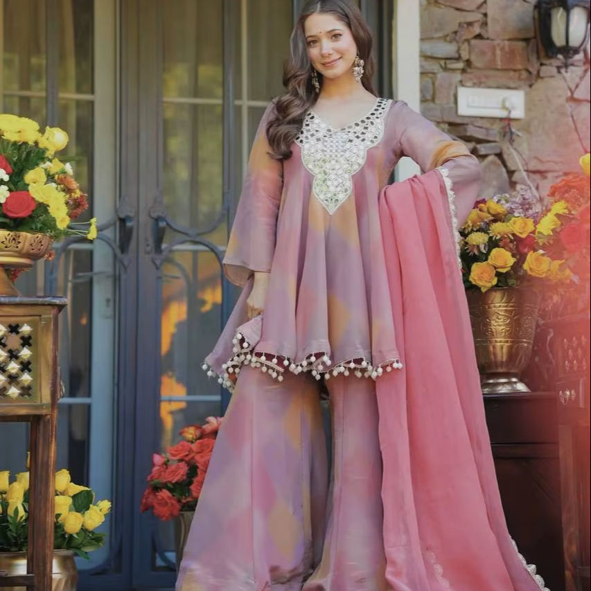 TOP PLAZZO Moderne, Robuste, en Soie COSMOS, avec Broderie Miroir et Fil, Ensemble Dupatta, Séchage Rapide, Décontracté Plage, Toutes Saisons