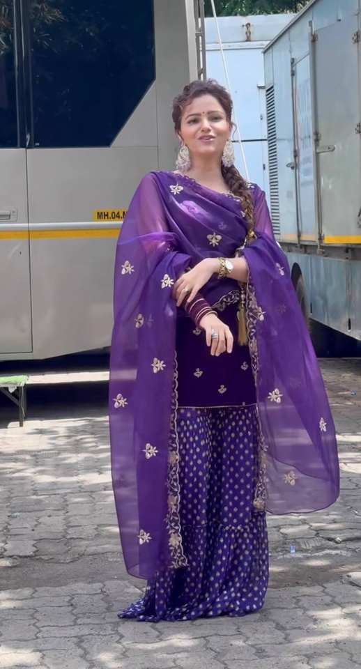 Ensemble de fête TOP SHARARA DUPATTA en velours de viscose, broderie vintage, coupe classique, couleur naturelle, automne, travail de séquence multi-couleurs, séchage rapide