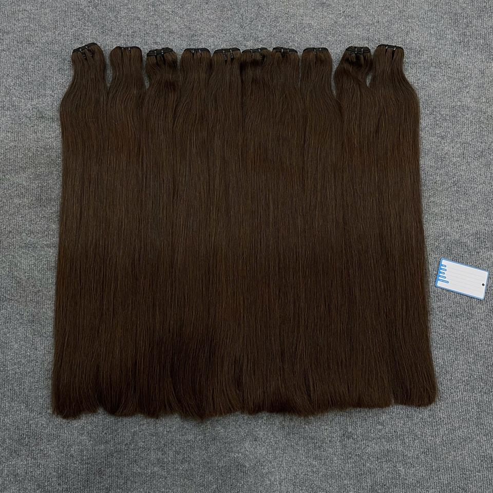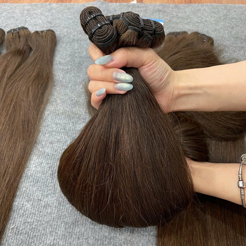 Extensions de cheveux naturels vietnamiens de qualité supérieure, tissées à la machine, pointes épaisses, couleur marron, sans perte ni nœuds.