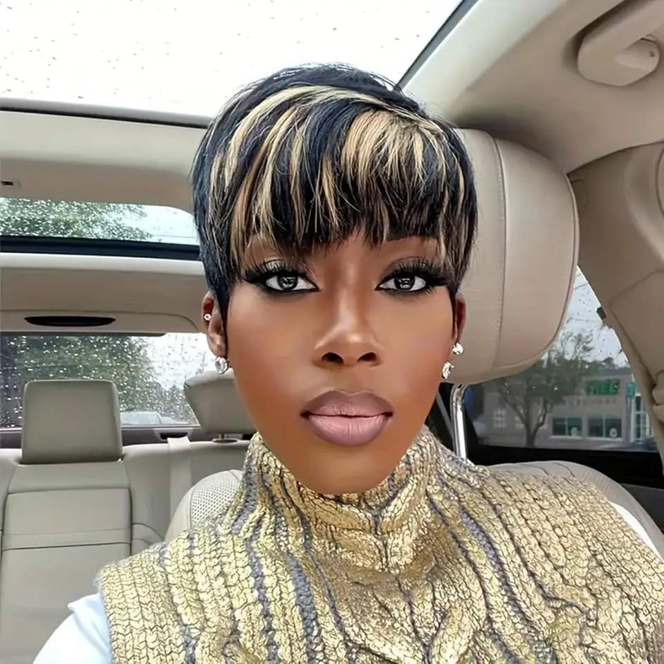 Perruque courte de type pixie en cheveux humains TOP1 pour femmes noires, couleur noire et blonde, coupe de cheveux courte en couches, perruque sans colle avec frange