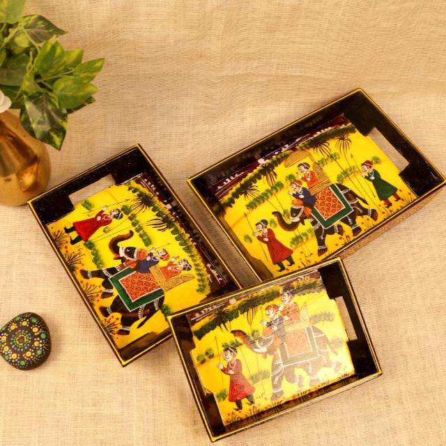 Ensemble de 3 plateaux peints à la main, style Art Déco, motif éléphant, collection Royal Rajasthan, pour mariage et Diwali