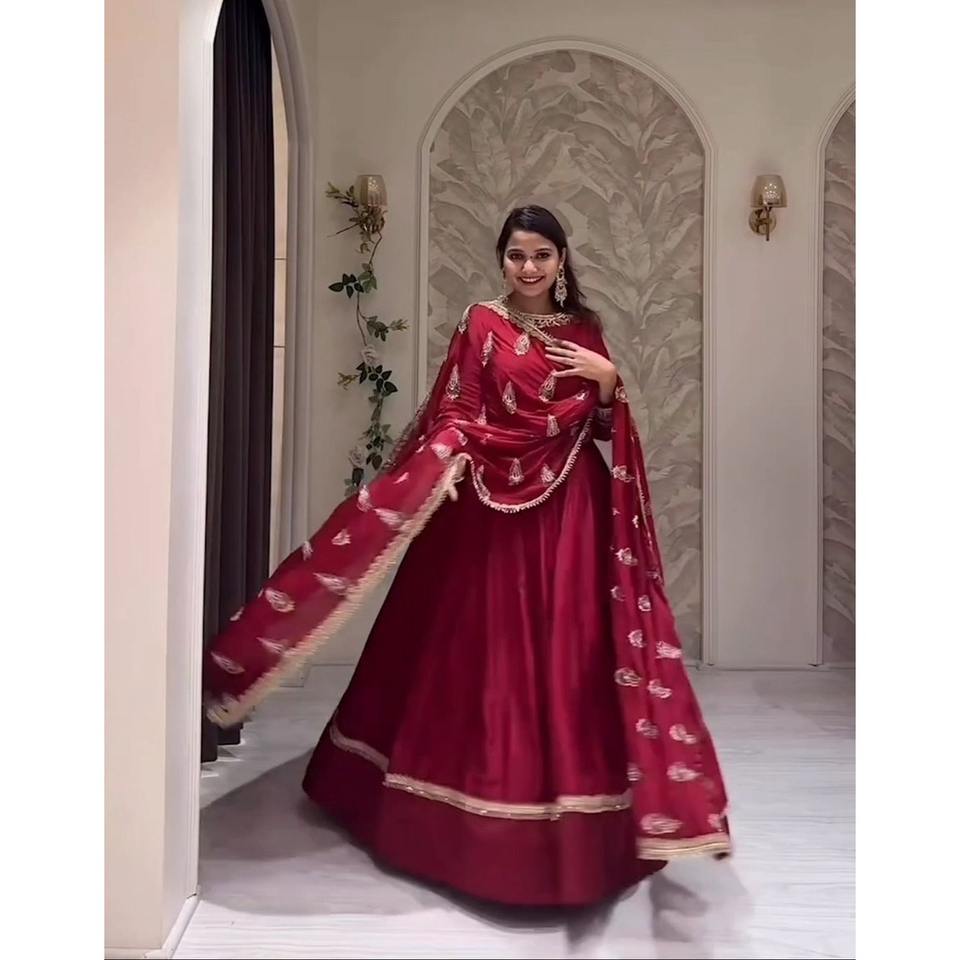TREANDING CHINON SILK EMBROIDERY SEQUENCE WORK GOWN BOTTOM WITH DUPATTA RED