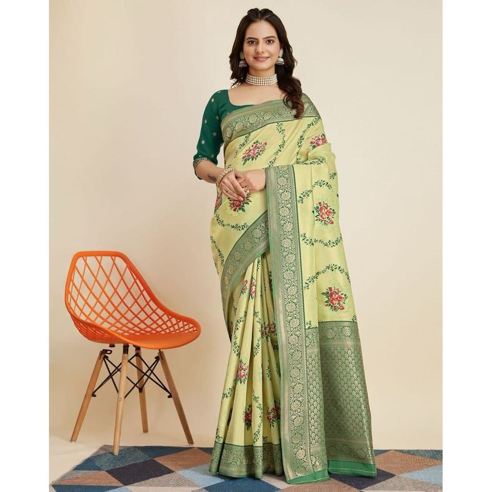 TRENDING KANJIVARAM SILK JACQUARD WORK SAREE WITH UNSTICTHED BLOUSE PERROT GREEN