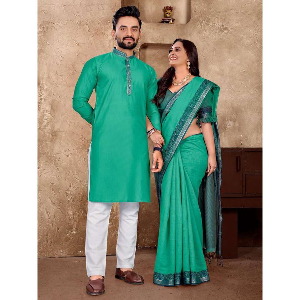 TENDANCE LIN SOIE JACQUARD TRAVAIL HOMME KURTA PAYJAMA ET SAREE AVEC BLOUSE INCOSÉE VERT