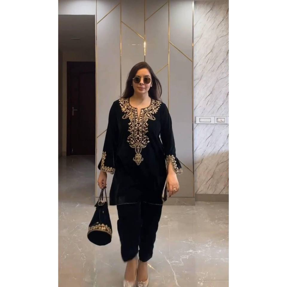 TRENDING VELVET EMBROIDERY SEQUENCE WORK KURTI WITH PALAZZO BLACK