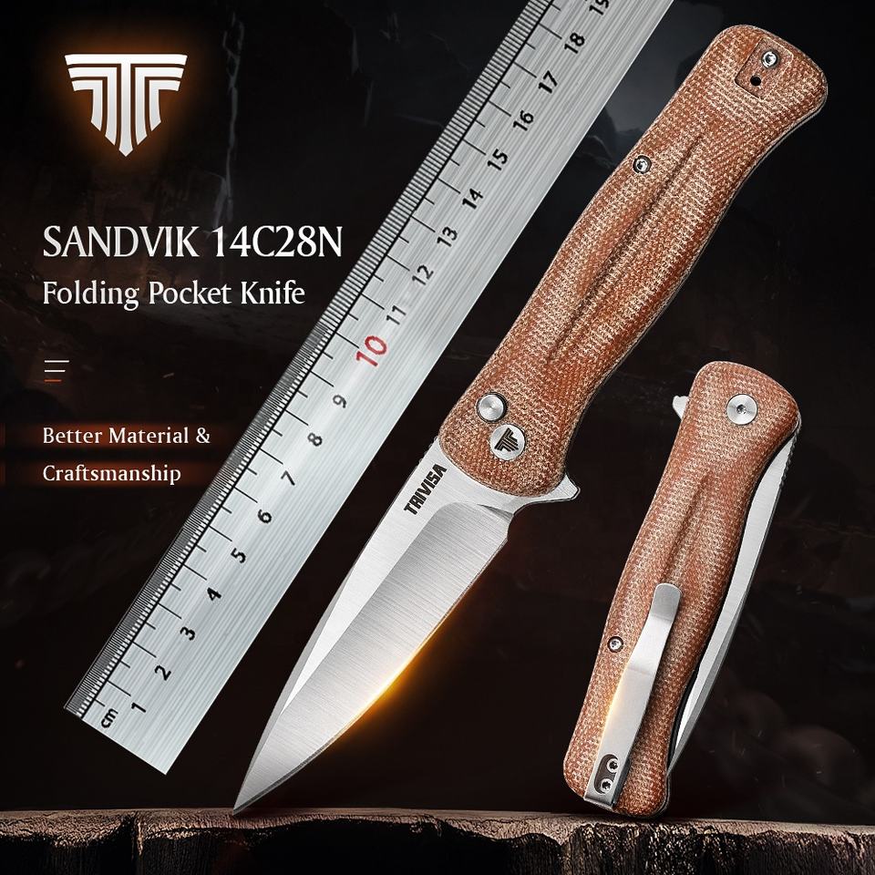 TRIVISA Stainless Steel 14C28N Blade Micarta Handle Camping Hunting EDC Tactical Folding Pocket Knife