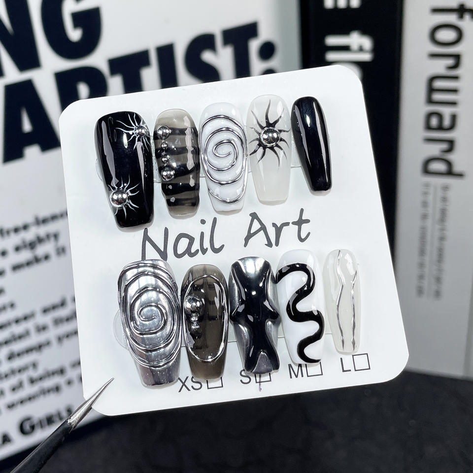 TSZS Faux ongles à presser faits main, design métal liquide, noirs brillants, réutilisables, en acrylique, couvrance totale, à coller