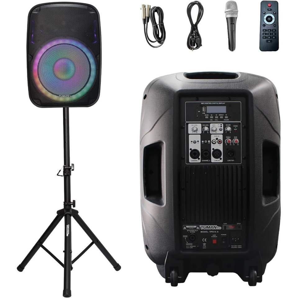Support de microphone portable TUMAN Pro de 15 pouces avec support pour carte USB SD, radio FM, DJ amplifié