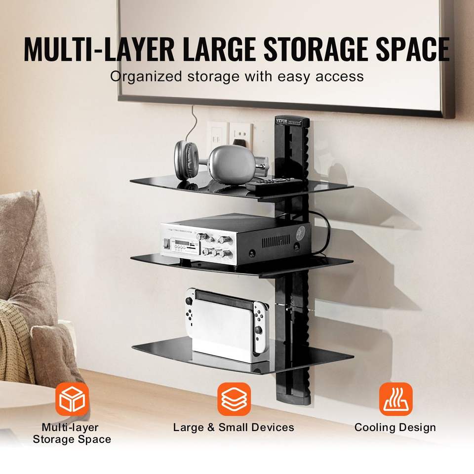 Étagère murale pour téléviseur, centre de divertissement flottant en verre, lecteur DVD, capacité de 18 livres, étagères murales renforcées
