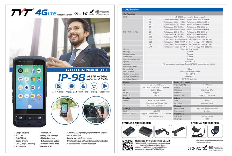TYT IP-98 4G Smartphone Poc Radio Kits Interphone Sans Fil Zello 4G LTE Talkie Walkie 4.0 pouces Écran Tactile Support IP98