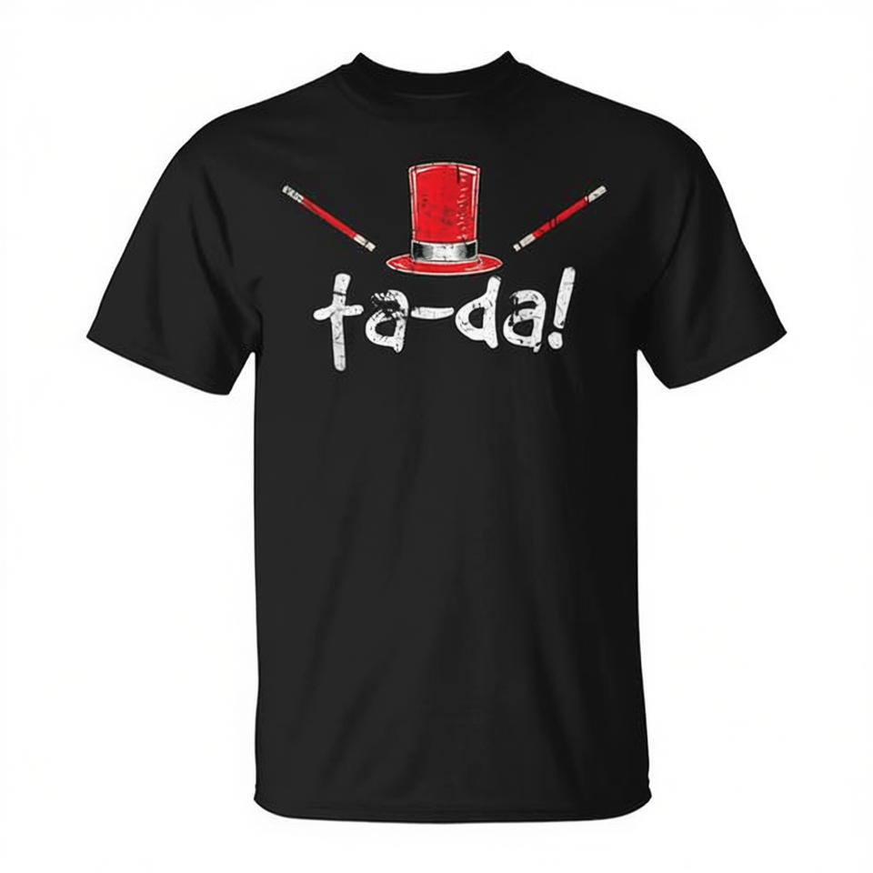 T-shirt promotionnel Ta-Da Abracadabra Magic Trick Wand Card, design accrocheur et intrigant