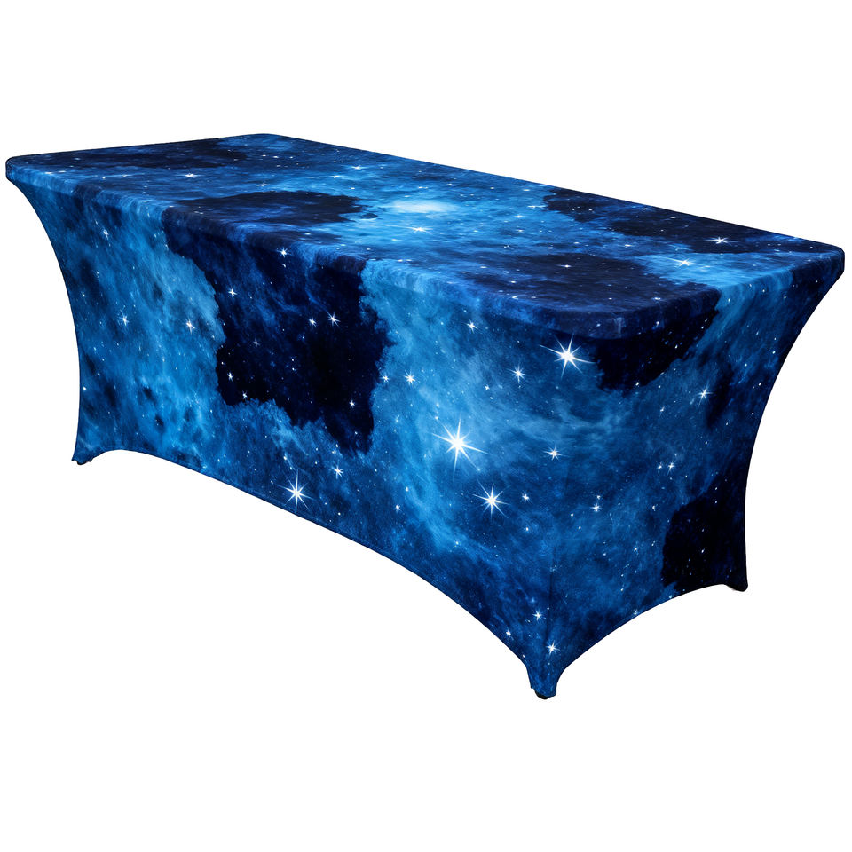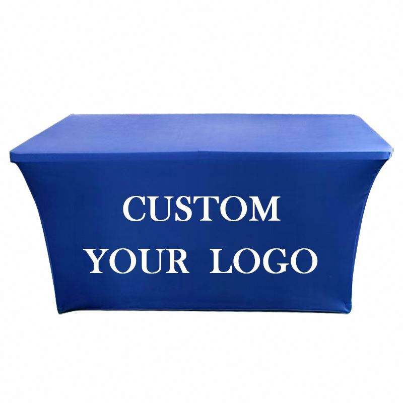 Housse de table pour table de 6 pieds, ajustement élastique, matériau en spandex, design portable, impression numérique, logo bleu marine pour les entreprises